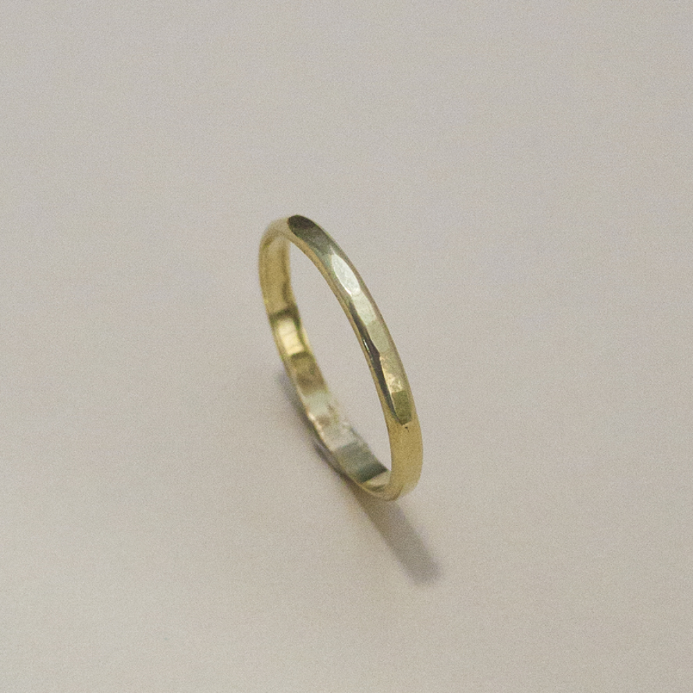 De ring is gemaakt van 14 karaats goud en vervolgens gehamerd, wat het handgemaakte benadrukt.