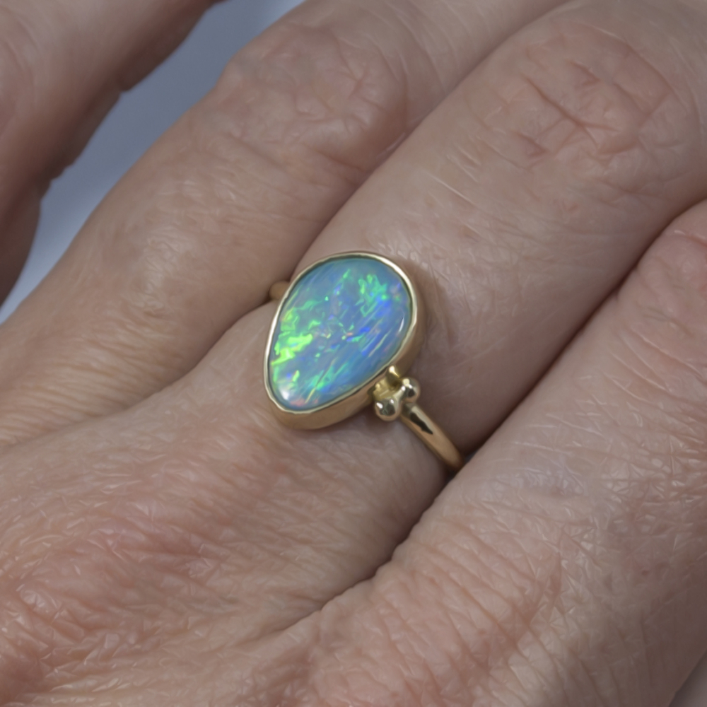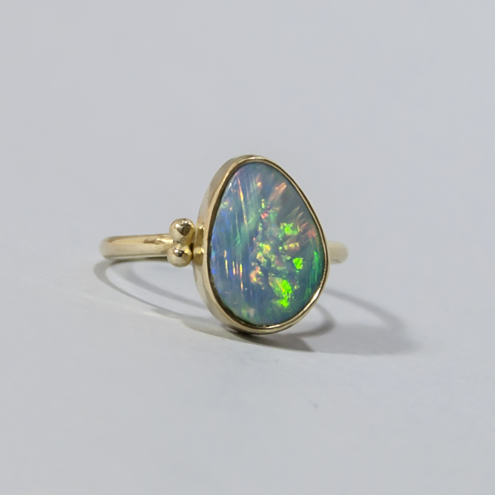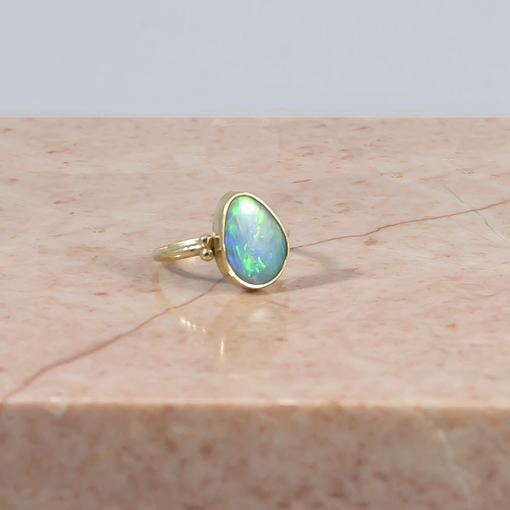 "De Koningin van de Edelstenen", zo wordt de prachtige opaal ook wel genoemd. Deze edelsteen kenmerkt zich door het rijke kleurenspel wat zichtbaar wordt met lichtinval en heeft een unieke glans. Deze opaal heeft een lichtblauwe tot turquoise kleur met groene, oranje en roze glinsteringen. De steen is geplaatst op een triplet met een beschermlaag, wat voor extra bescherming zorgt voor deze toch kwetsbare steen. De steen is free-form en is gezet in 14 karaats goud met details aan de zijkant. De combinatie van goud als de zonsondergang en opaal van de turquoise zee.