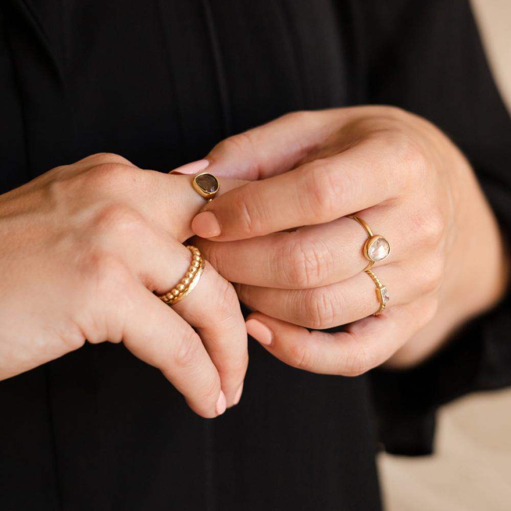 Statement ring in 14 karaats goud die je enkel kan dragen of te combineren met andere aanschuifringen. De gouden ring bestaat uit een rij balletjes, ook wel pareldraad genoemd. Verkrijgbaar in 2 breedtes; Op de foto's zie je het model van 2mm dikte.