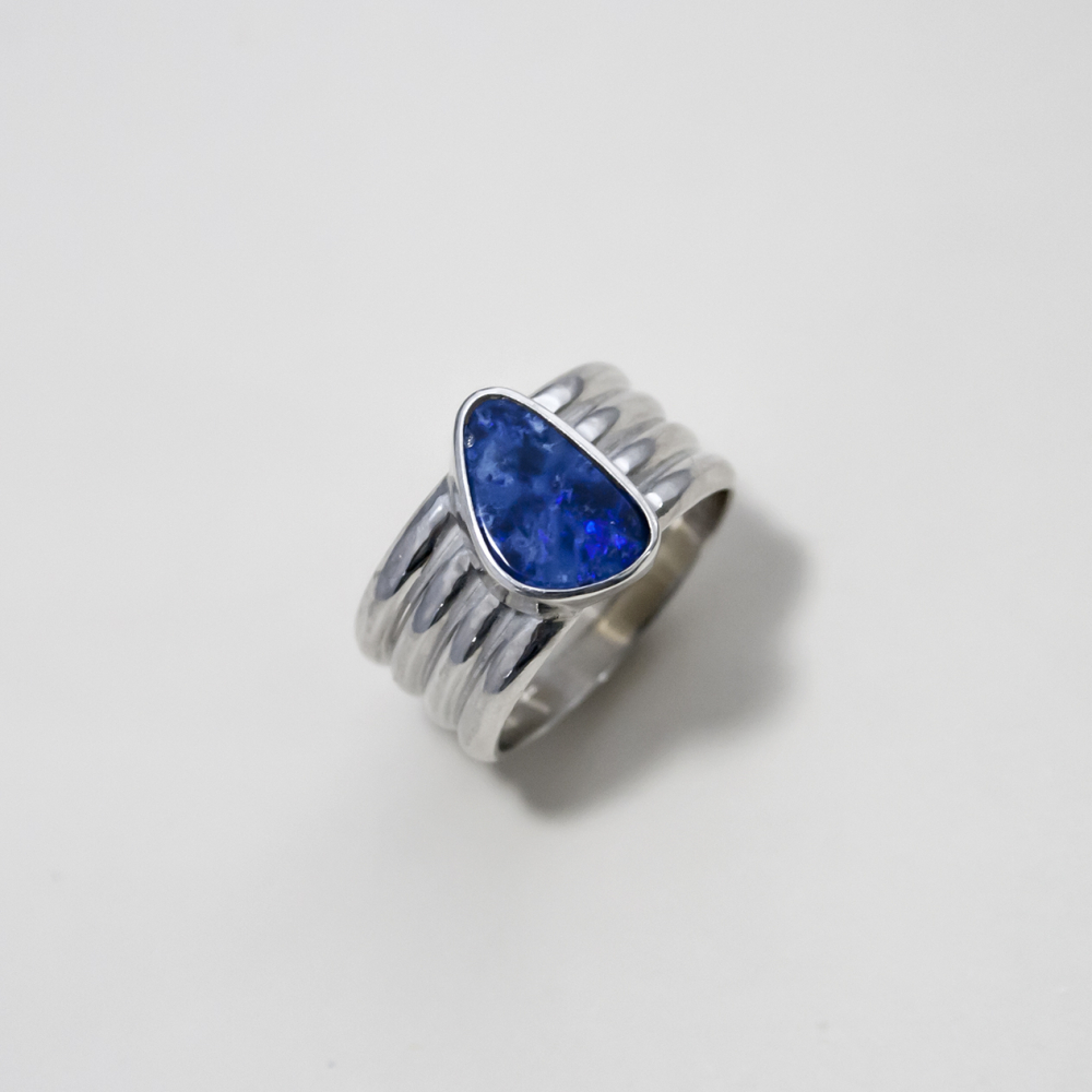 "De Koningin van de Edelstenen", zo wordt de prachtige opaal ook wel genoemd. Deze edelsteen kenmerkt zich door het rijke kleurenspel wat zichtbaar wordt met lichtinval en heeft een unieke glans. Deze opaal heeft een lichtblauwe tot donkerblauwe kleur. De meervoudige ringbanden dragen de free form opaal. Het is een doublet opaal, waarbij een dun laagje van de kleurrijke natuurlijke opaal op een mix van natuursteen en hars is geplaatst.